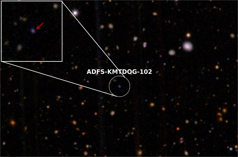 <주변 먼지 속에 있는 천체임에도 KMTNet 망원경에서 가시광으로 푸르게 관측된 천체(ID: ADFS-KMTDOG-102) 이미지 : 천문연구원 제공>