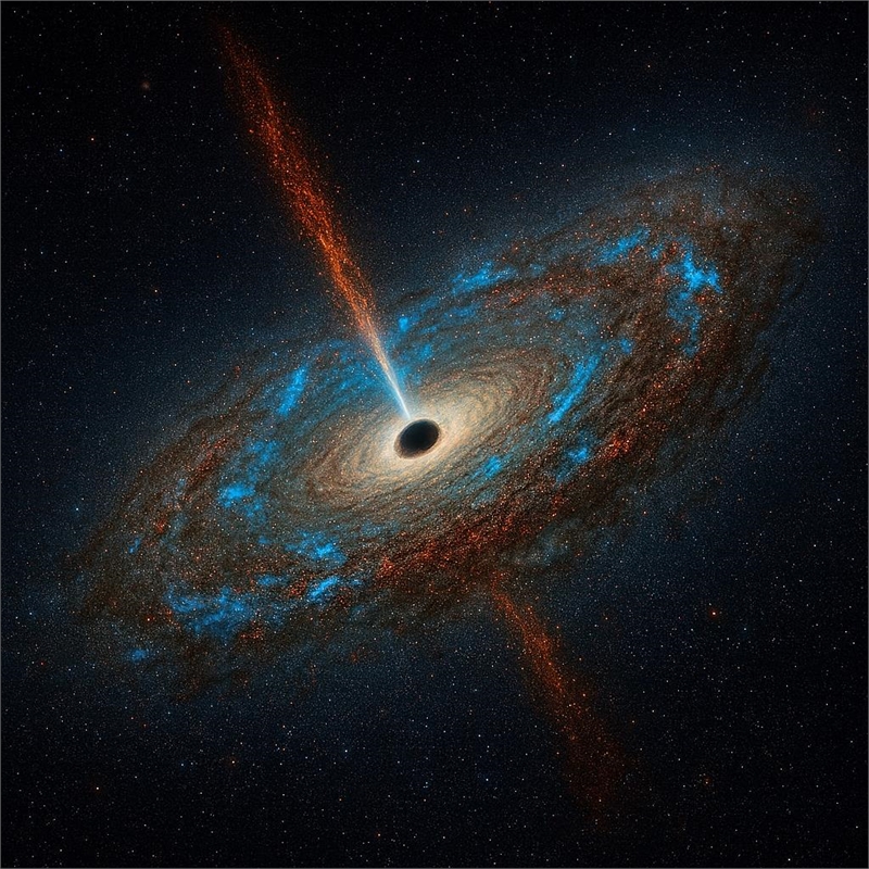 <두꺼운 먼지에 싸인 모은하에서 강한 푸른빛이 보이는 초대질량 블랙홀 은하 상상도(천체 정보 바탕으로 AI로 생성) : 천문연구원 제공>