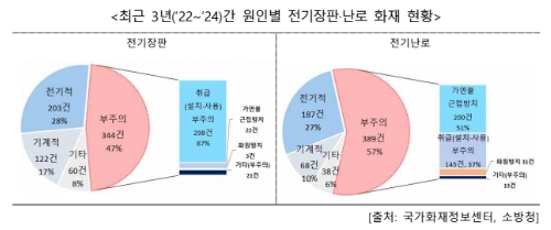 원인별로는 전기장판과 전기난로 모두 부주의로 인한 화재가 가장 많았다. 부주의로 인한 화재 중, 전기장판은 취급 부주의가 대부분(298건, 87%)을 차지했다.