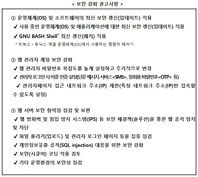 또한, 1월 6일에는 추가적인 정보 탈취 등 피해 발생을 예방하기 위해 보호나라(www.boho.or.kr) → 알림 마당 → 보안 공지를 통해 ‘최근 침해사고 증가에 따른 기업 보안 강화 요청’ 보안 공지문을 게시하였고, 정보 보호 최고 책임자(CISO) 및 사이버 위협 정보 분석 공유 시스템(C-TAS) 회원사를 대상으로 보안점검과 취약점 조치를 강화할 것을 요청하였다.