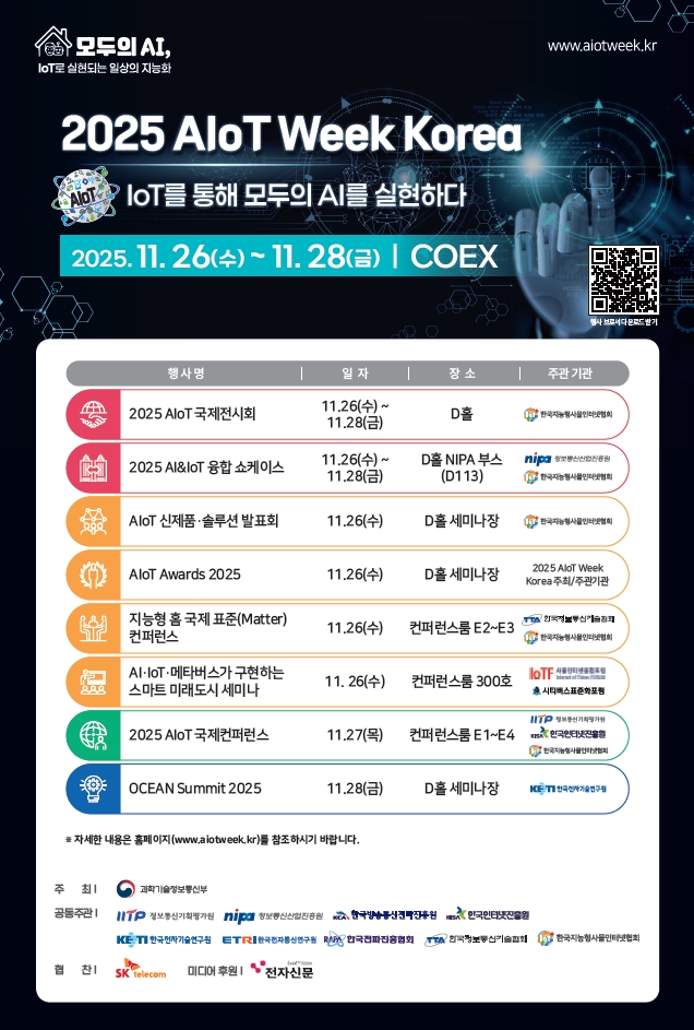 과학기술정보통신부(부총리 겸 과기정통부 장관 배경훈, 이하 ‘과기정통부’)는 11월 26일(수)부터 11월 28일(금)까지 3일간 지능형 사물인터넷(AIoT) 활성화와 산업 경쟁력 제고를 위한「2025 한국 지능형 사물인터넷 주간(AIoT Week Korea)」를 코엑스에서 개최한다.최근 사물인터넷(IoT)은 인공 지능(AI)과 결합하여 지능형 사물인터넷