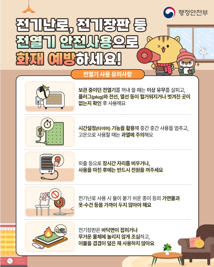 행정안전부(장관 윤호중)는 최근 날씨가 추워지며 전기장판·난로 등 전열기 사용이 증가함에 따라, 사용 시 화재 안전에 각별한 주의를 요청했다.최근 3년(’22~’24)간 전기장판*과 전기난로** 관련 화재는 총 1,411건 발생했으며, 이로 인해 16명이 사망하고 131명이 부상을 입었다. 시기별로는 기온이 큰 폭으로 떨어지는 12월과 1월에 화재가 가장
